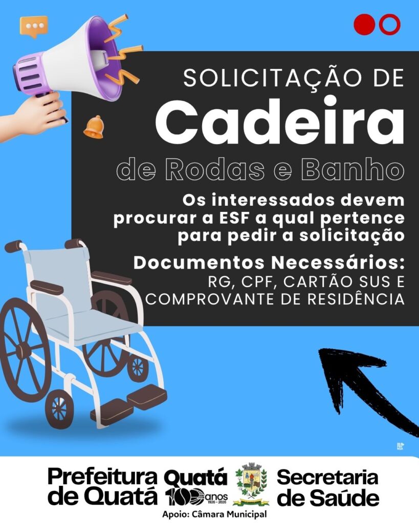 Quatá, SP- A Prefeitura Municipal de Quatá informa que as pessoas que necessitarem de cadeira de rodas ou de banho, para que possam entrar em contato com a ESF a qual pertence munidos de RG, CPF, Cartão SUS e comprovante de residência para fazer a solicitação.