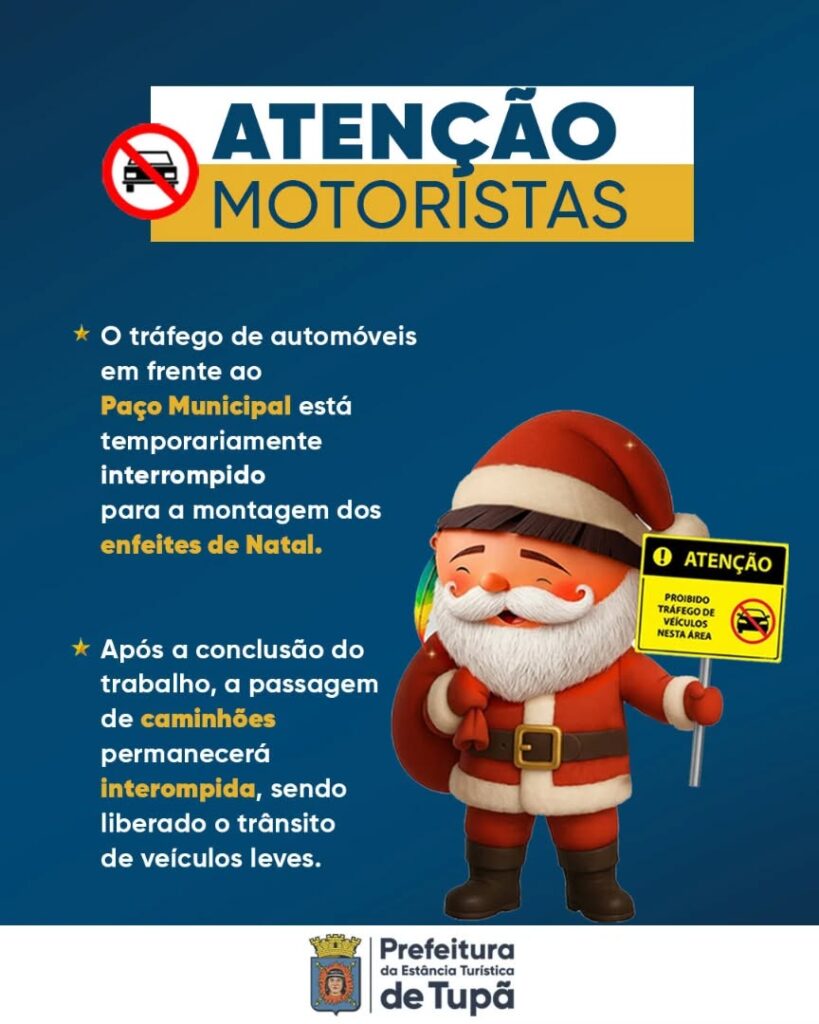 Tupã, SP- A via diagonal que passa em frente ao Paço Municipal, ligando as ruas Cherentes e Goitacazes, vai ter o tráfego de veículos impedido durante o período de instalação de enfeites do Natal de Luz.