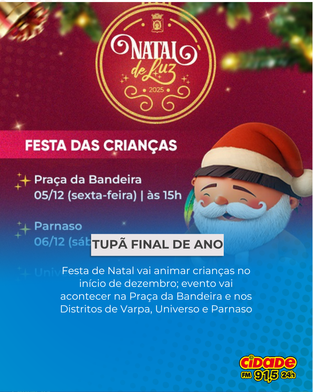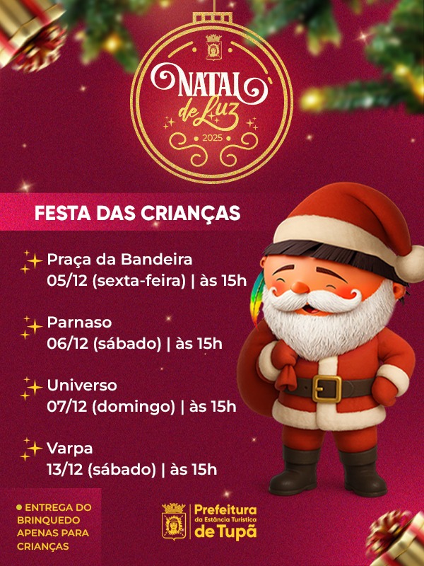 Tupã, SP- A Prefeitura anunciou as datas de realização da Festa das Crianças, que integra a programação do Natal de Luz. O evento, que é marcado pela distribuição de guloseimas e presentes às crianças, acontece no dia 5 de dezembro, na Praça da Bandeira, e nos distritos de Parnaso (dia 6), Universo (7) e Varpa (13), sempre a partir das 15h.
