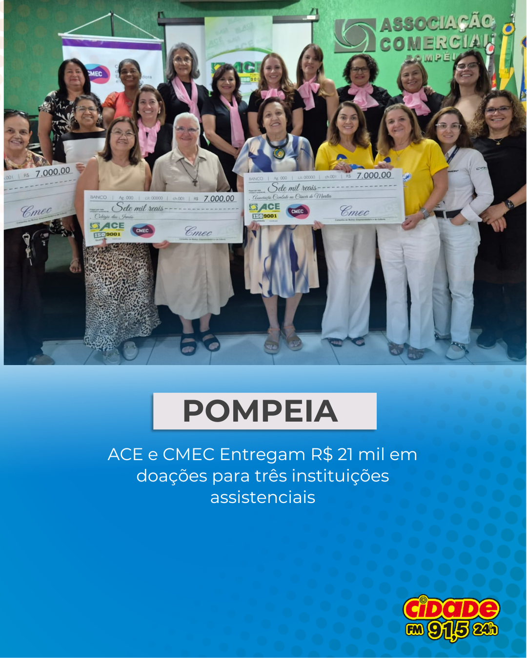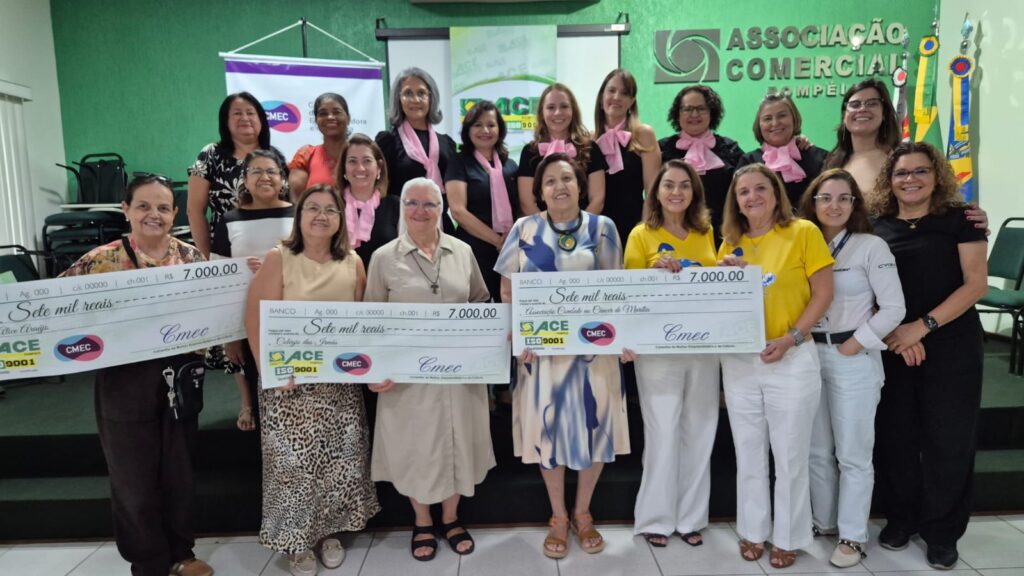 Pompeia, SP- A Associação Comercial e Empresarial de Pompeia (ACE) e o CMEC – Conselho da Mulher Empreendedora e da Cultura realizaram, na tarde desta quarta-feira (26/11), a entrega de cheques no valor de R$ 7 mil para cada uma das três instituições beneficiadas pela campanha Outubro Rosa 2025: Associação de Combate ao Câncer de Marília (que atende Marília e região), Lar da Criança Alice Araújo e Colégio das Irmãs.