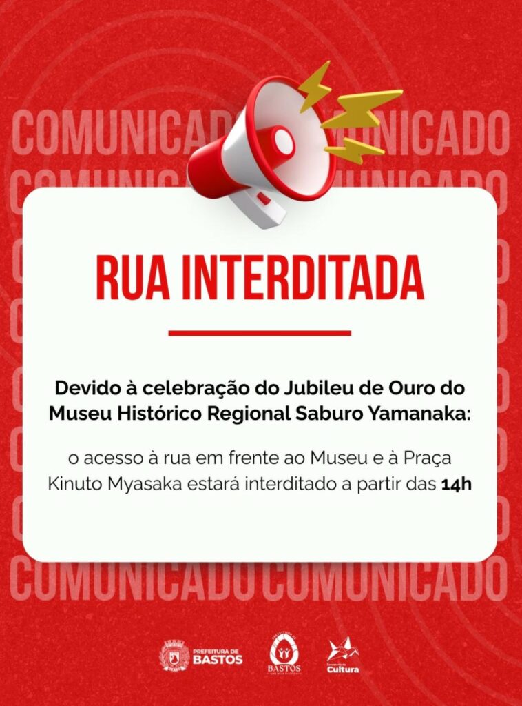 Bastos, SP- Em razão da celebração do Jubileu de Ouro do Museu Histórico Regional Saburo Yamanaka, o acesso à rua em frente ao Museu e à Praça Kinuto Myasaka estará interditado a partir das 14h.