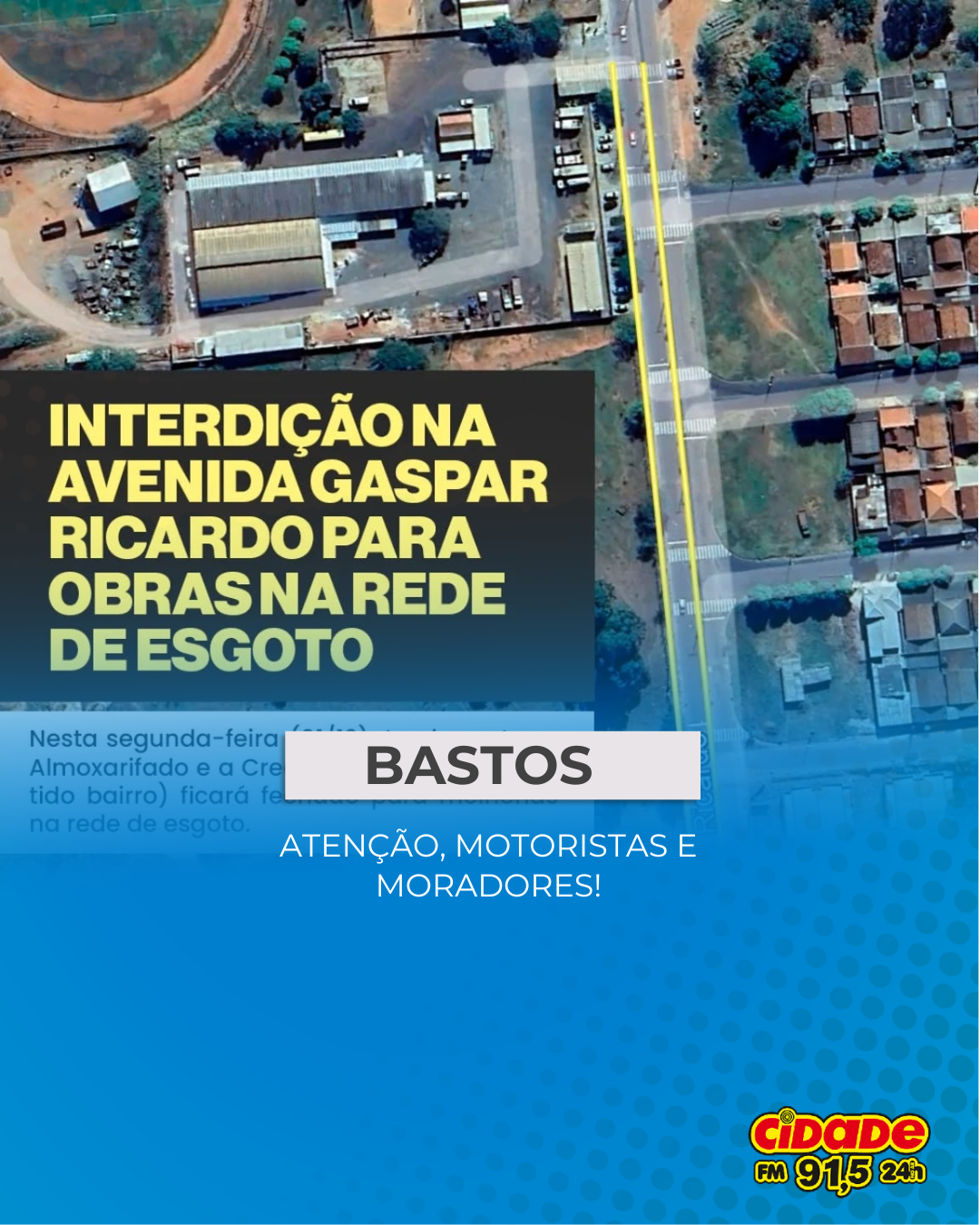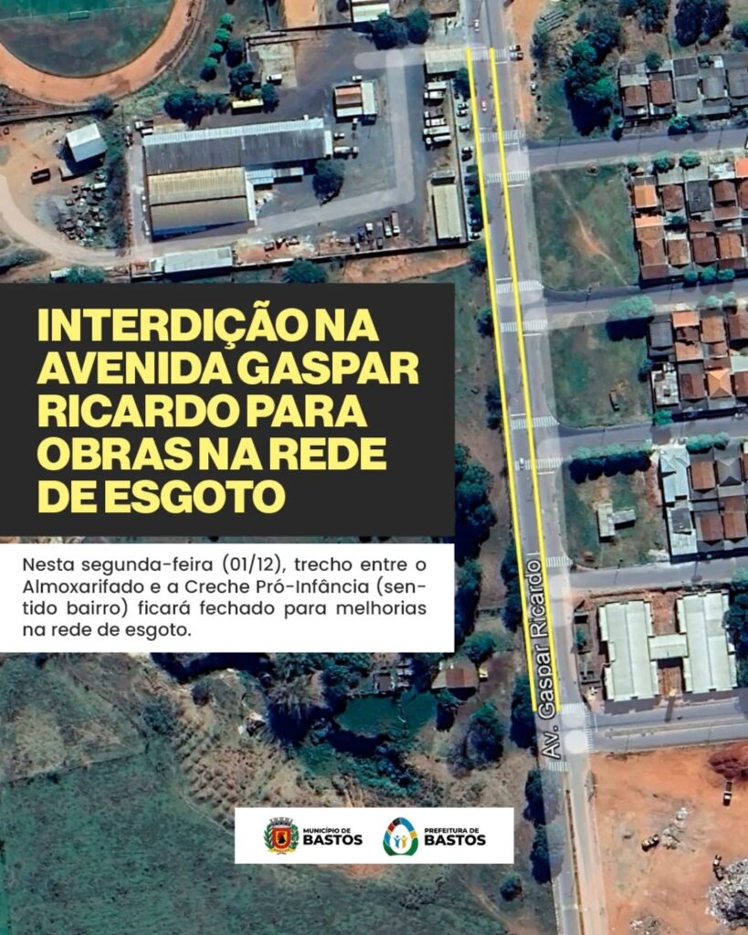 🚧Bastos, SP- Nesta segunda-feira, 01 de dezembro, um trecho da Avenida Gaspar Ricardo — entre o Almoxarifado e a Creche Pró-Infância (sentido bairro) — ficará interditado para execução de melhorias na rede de esgoto.
