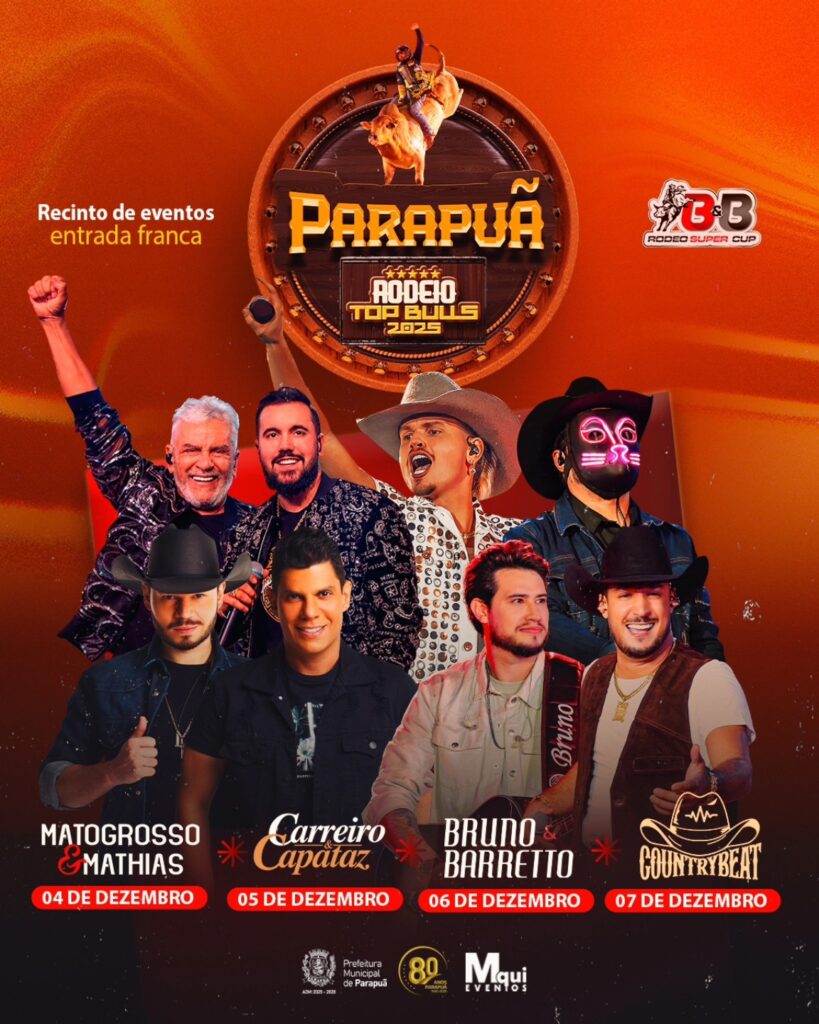 Parapuã, SP- No dia 04 de dezembro, o Parapuã Rodeio Top Bulls 2025 recebe a grandeza de Matogrosso & Mathias. Duas vozes que atravessam gerações e dão vida aos maiores hinos do sertanejo.