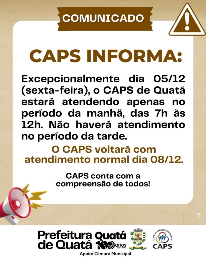 Quatá, SP- A Prefeitura Municipal de Quatá informa que excepcionalmente o CAPS de Quatá estará atendendo somente no período da manhã das 7h às 12h na próxima sexta-feira (05), não havendo atendimento no período da tarde.