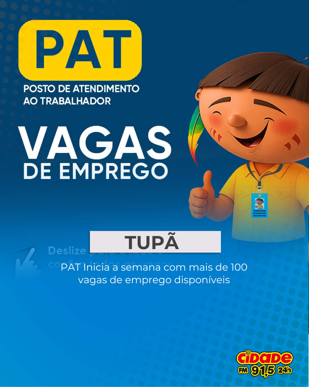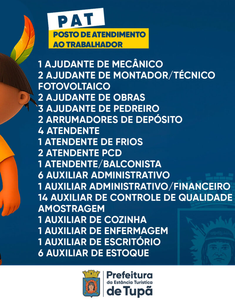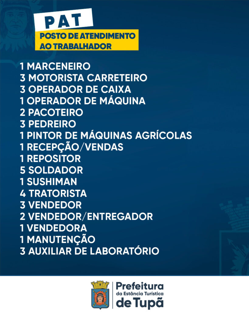 Tupã, SP- O Posto de Atendimento ao Trabalhador de Tupã (PAT) abriu a semana com mais de 100 de vagas de emprego disponíveis. A grande oferta ilustra o bom momento vivido pelo município, resultado do trabalho realizado pela Prefeitura que busca criar condições para o desenvolvimento de empresas e, com isso, aquecer o mercado de trabalho.