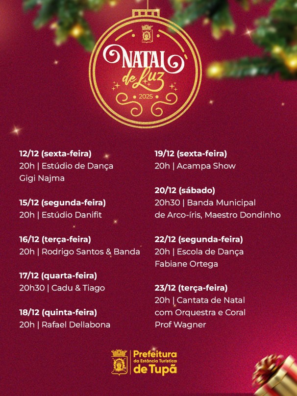Além da estrutura física que está sendo montada no centro da cidade, a Prefeitura organizou uma série de atividades artísticas e culturais, que vai acontecer no palco do espaço “Zé Pretinho” e ajuda a tornar o fim de ano ainda mais especial. A programação completa é a seguinte: