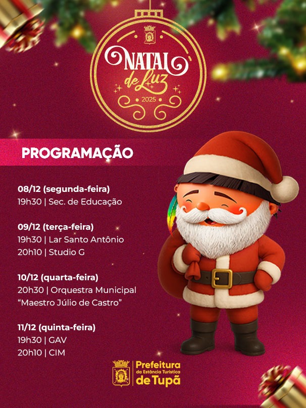 A decoração natalina vai ser marcada por atrações inéditas, muito brilho e um toque de artesanato que, combinados, devem criar um clima único, resgatando a tradição das festividades natalinas em Tupã. “O objetivo é trazer este clima para todos os tupãenses, mas também atrair visitantes da região e, com isso, incrementar o turismo”, complementou o prefeito.