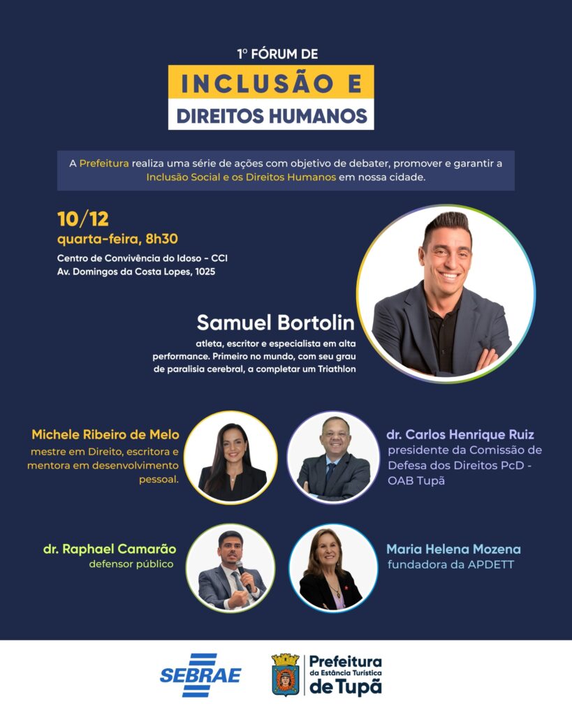 A Mesa de Palestrantes sobre os Direitos da Pessoa com Deficiência será composta por figuras importantes da defesa e promoção dos direitos sociais: Maria Helena Mozena, fundadora da APDETT e referência na luta pela inclusão em Tupã; Carlos Henrique Ruiz, presidente da Comissão de Defesa dos Direitos da Pessoa com Deficiência da OAB/Tupã; e Raphael Camarão, Defensor Público.