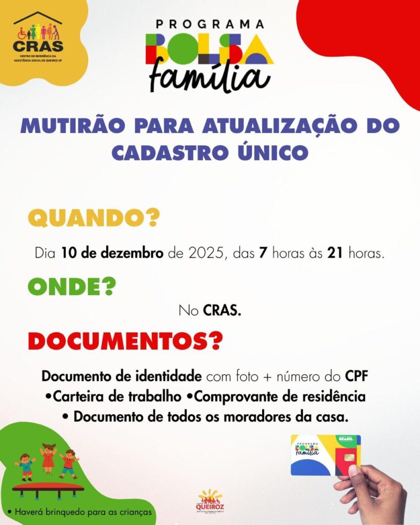 Queiroz, SP- A Prefeitura Municipal de Queiroz comunica que no próximo dia 10 de dezembro, será realizado o mutirão de atualização do cadastro único, que acontecerá no CRAS, das 7h às 21h.