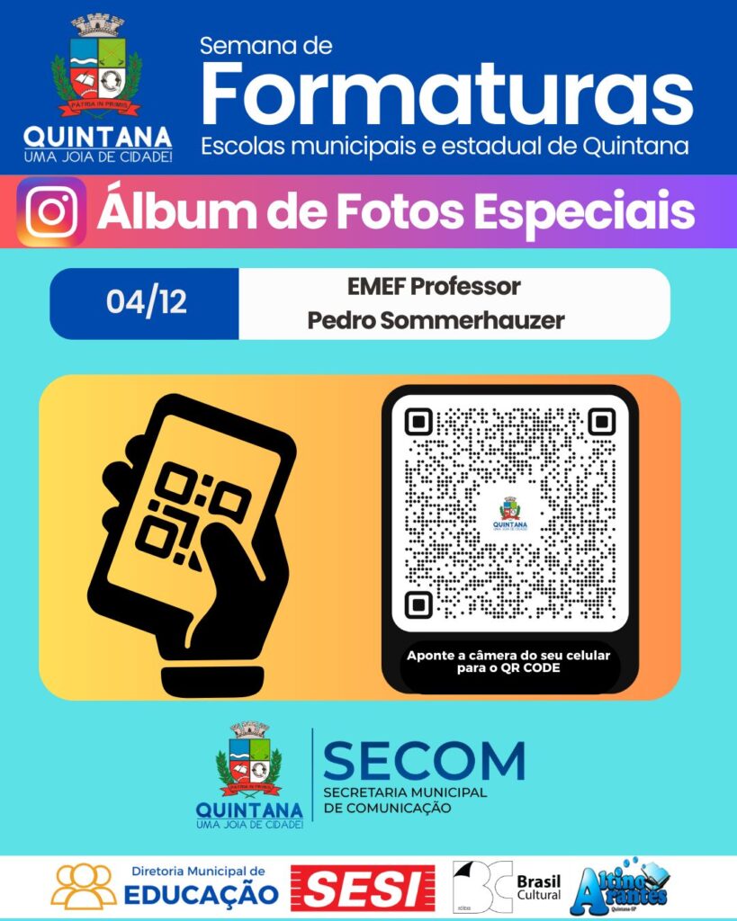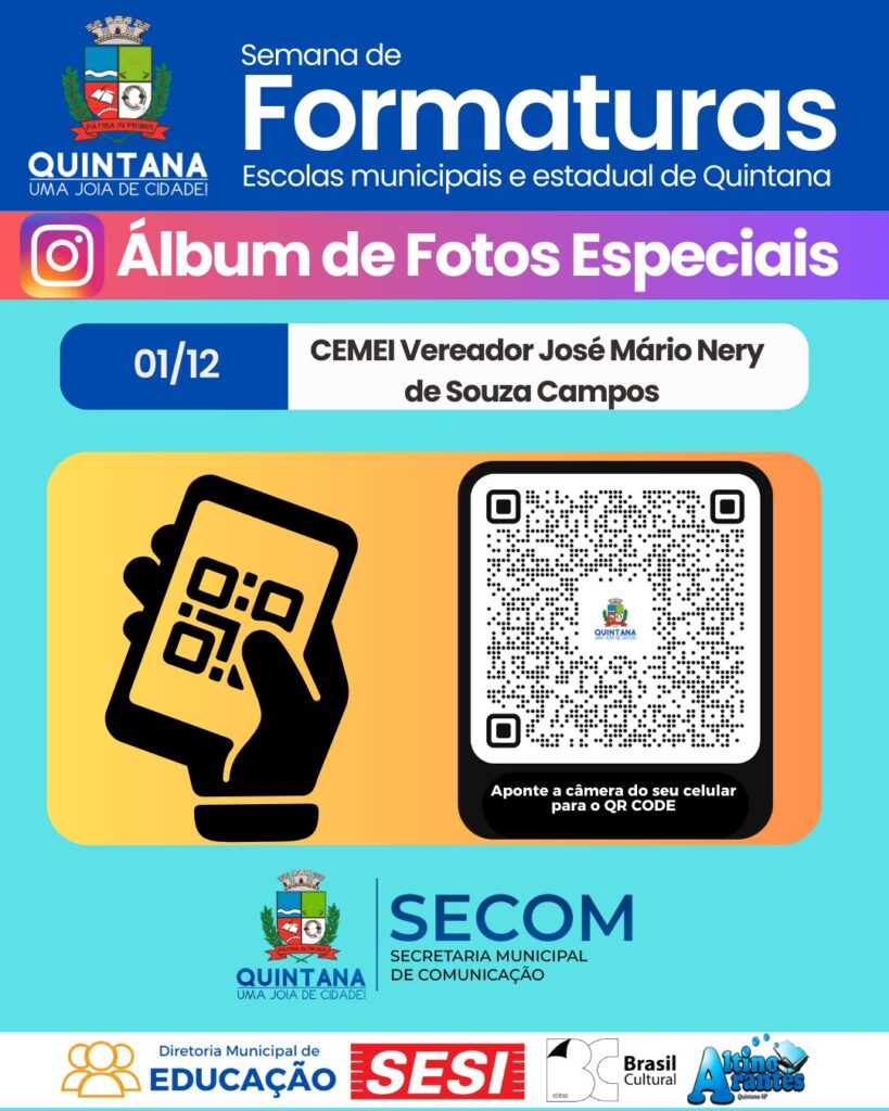 Com uma iniciativa moderna e inteligente, o Governo de Quintana disponibilizou todas as fotos oficiais das formaturas das escolas municipais, por meio de QR Codes exclusivos para cada dia e escola. Basta apontar a câmera do celular e reviver cada sorriso, cada abraço e cada conquista de forma rápida, gratuita e organizada!