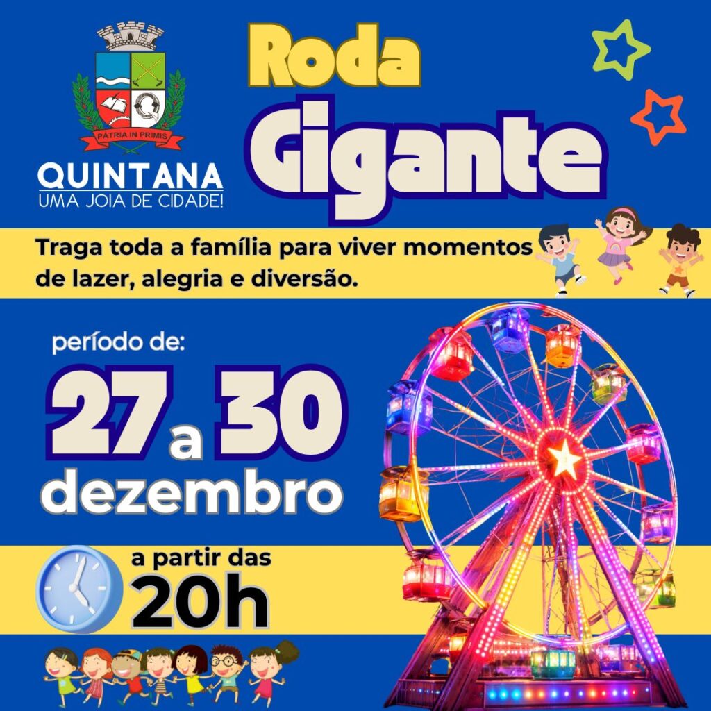 Quintana, SP- O Governo de Quintana oferece à população mais uma grande opção de lazer e convivência: a Roda Gigante, que estará disponível de 27 a 30 de dezembro, a partir das 20h, proporcionando momentos de alegria, diversão e integração para toda a família ![]()