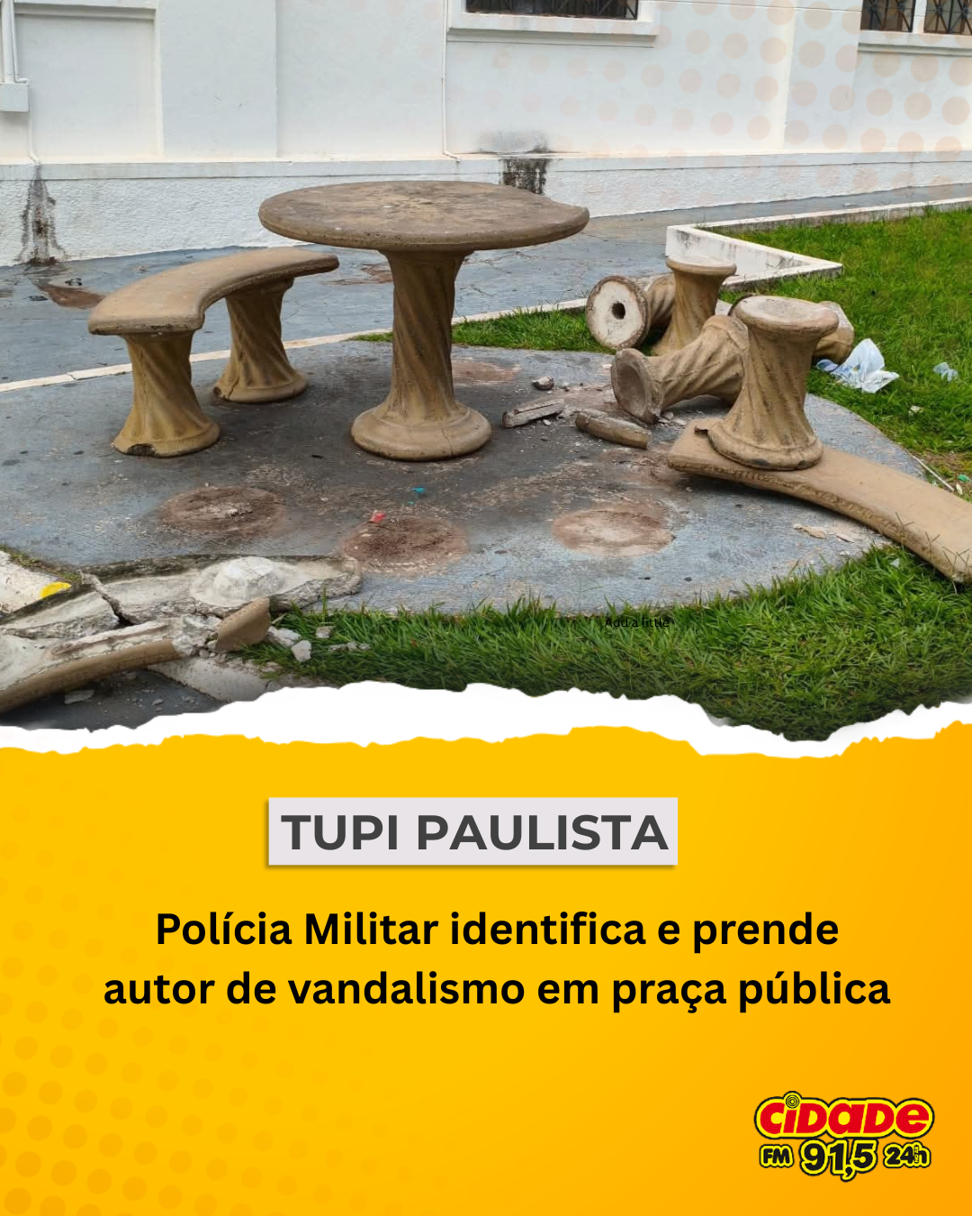 Tupi Paulista, SP- A Polícia Militar identificou, localizou e prendeu o autor da destruição dos bancos de cimento da praça pública em frente à Câmara Municipal de Tupi Paulista. A ação ocorreu neste domingo (28), após um trabalho conjunto entre a PM e moradores da cidade, que colaboraram com imagens de câmeras de segurança.