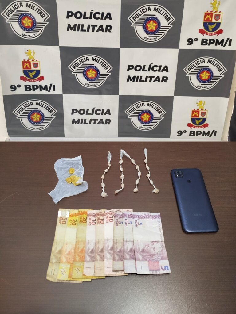 Durante a abordagem, nada de ilícito foi encontrado na revista pessoal. No entanto, ao recuperar a bolsa dispensada, os policiais localizaram 20 porções de crack embaladas e prontas para venda, três pedras brutas da mesma droga e R$ 135 em dinheiro, em notas fracionadas.