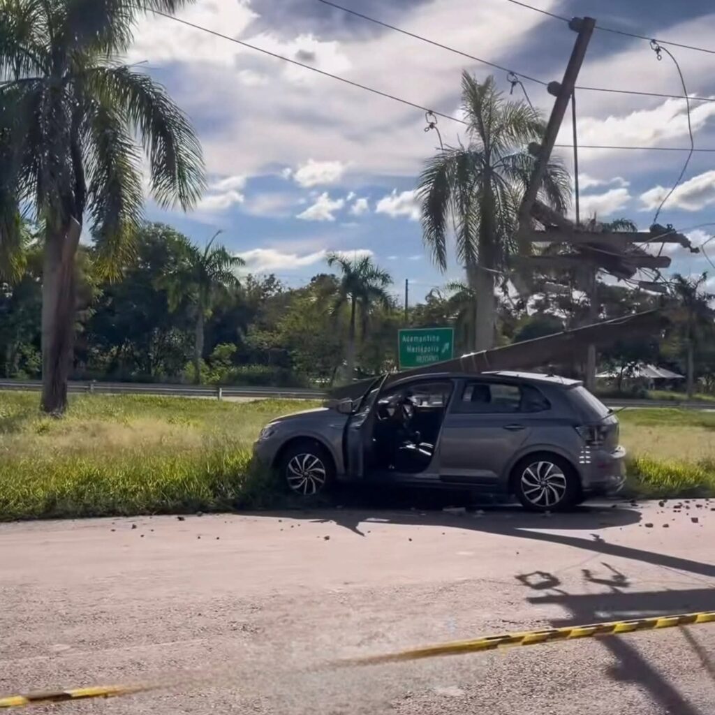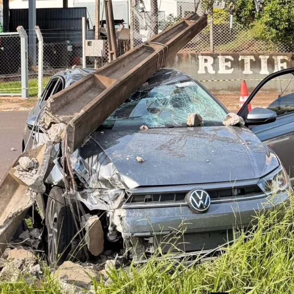 Com o impacto, o poste quebrou em três partes e ficou suspenso pelo cabeamento elétrico. O carro sofreu danos significativos, principalmente na parte frontal, no capô do motor e no teto. As circunstâncias do acidente serão apuradas.