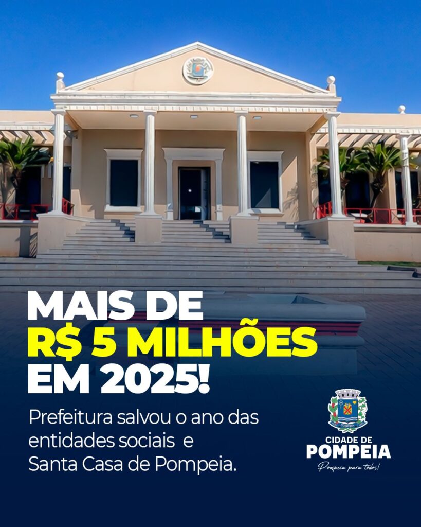 Pompeia, SP- Em 2025, Pompeia enfrentou um cenário crítico: a falta de doações empresariais colocou em risco o funcionamento de importantes entidades sociais e da Santa Casa. Diante da gravidade da situação, a Prefeitura assumiu a responsabilidade e destinou mais de R$ 5 milhões em recursos próprios para garantir a continuidade dos atendimentos, proteger serviços essenciais e cuidar de quem mais precisa.
