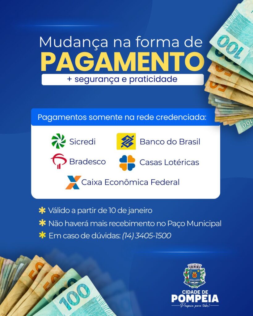 Pompeia, SP- A partir do dia 10 de janeiro, a Prefeitura de Pompeia não realizará mais o recebimento presencial de pagamentos no Paço Municipal.