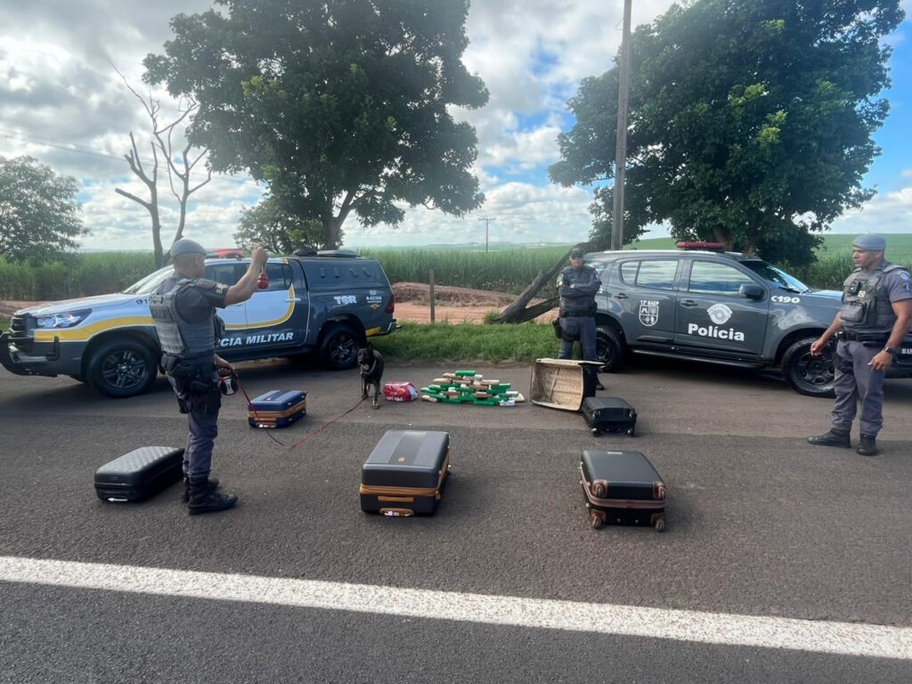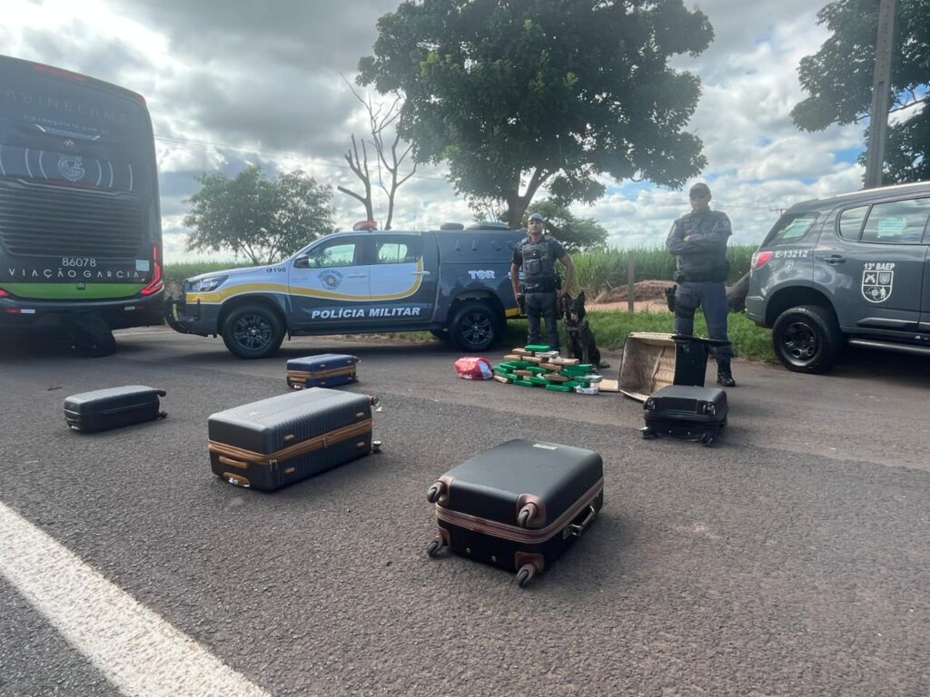 A abordagem foi realizada por equipes do Policiamento Rodoviário, com apoio do Canil do 13º BAEP. Durante a fiscalização no compartimento de bagagens, os cães farejadores indicaram uma mala suspeita. No interior, os policiais encontraram 23 tabletes de maconha, totalizando 11,286 quilos da droga.