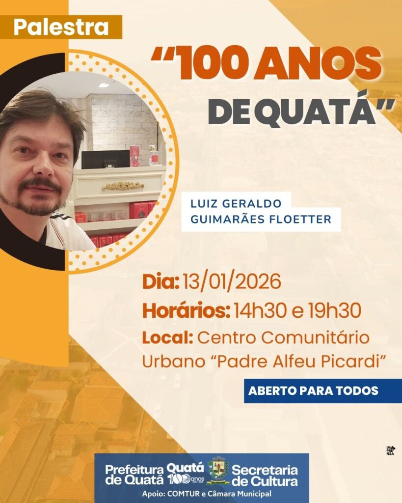 Quatá, SP- A Prefeitura Municipal de Quatá convida toda a população para a palestra “100 Anos de Quatá”, a ser ministrada no dia 13 de Janeiro em dois horários; às 14h30 e às 19h30, no Centro Comunitário Urbano “Padre Alfel Picardi”.