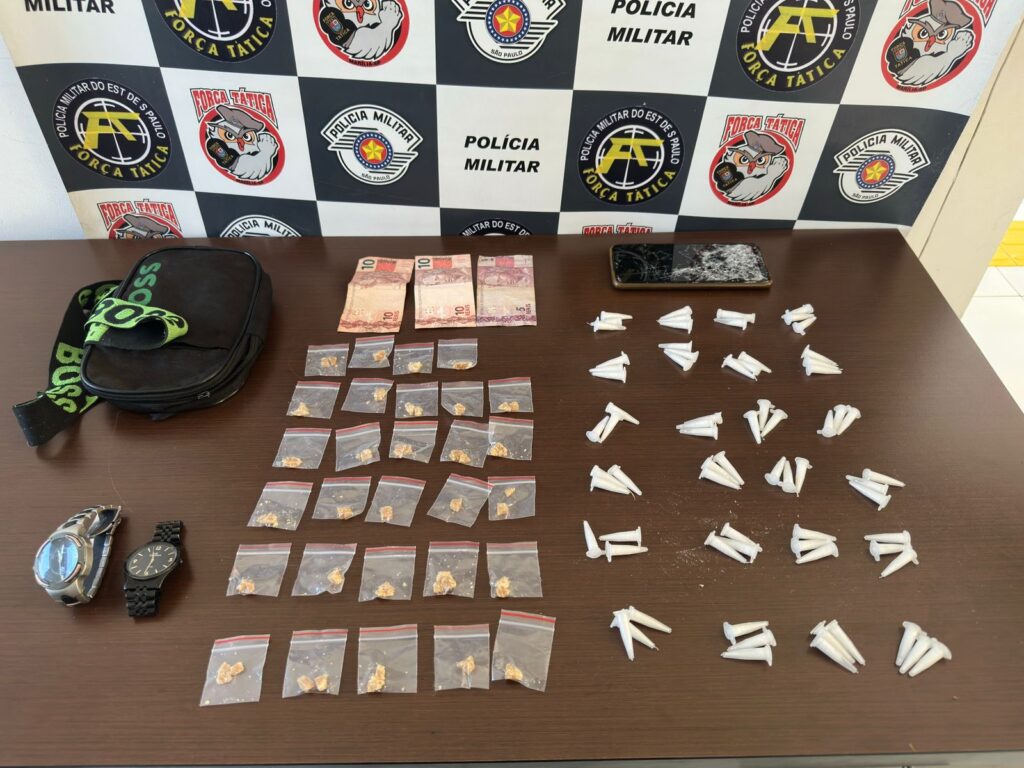 A equipe se dividiu e conseguiu deter o suspeito do outro lado da quadra. Ao mesmo tempo, os policiais entraram no imóvel, cujo portão estava apenas encostado, e localizaram sobre um sofá 72 pinos de cocaína, 29 invólucros do tipo zip lock contendo crack, R$ 25 em dinheiro, além de dois relógios e documentos pessoais.