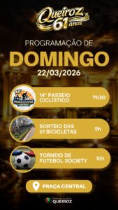 A cidade de Queiroz comemora seus 61 anos de emancipação político-administrativa com uma noite cheia de energia, esporte e diversão na Praça Central, neste sábado, dia 21 de março.