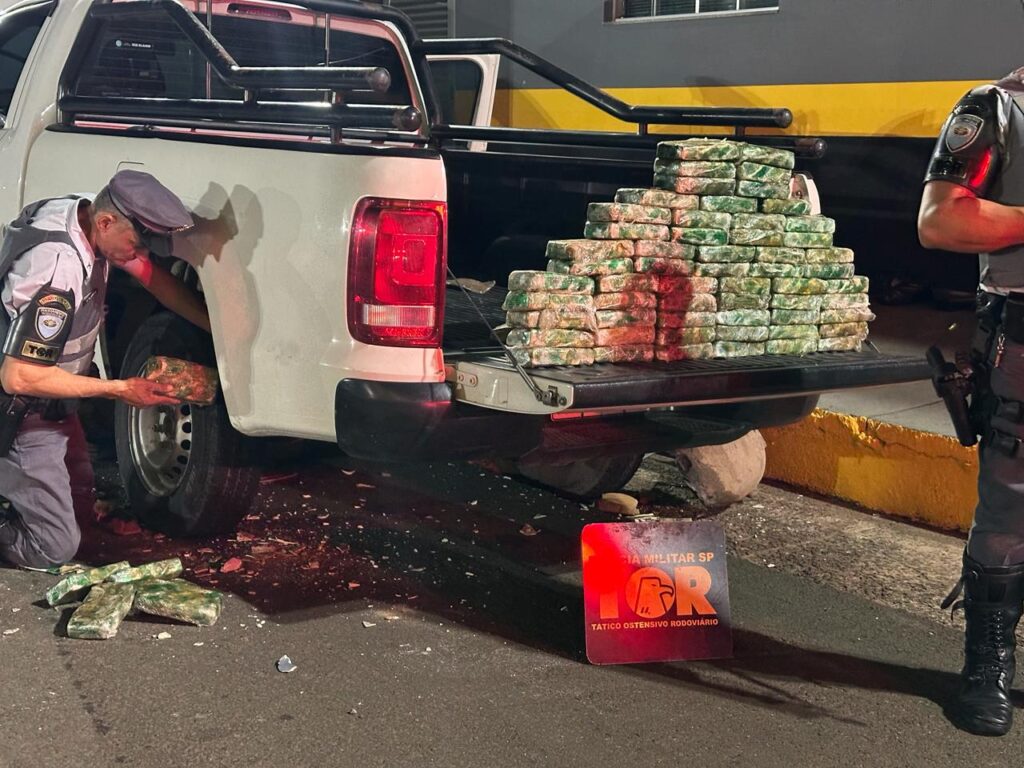 Durante a inspeção, os policiais descobriram um fundo falso na carroceria da caminhonete, onde estava ocultado um grande carregamento de drogas. Foram encontrados 65 tabletes de cocaína, totalizando 67,400 kg da substância ilícita, correspondendo à pasta base. Além da droga, também foram apreendidos valores em espécie e o veículo utilizado pelo casal.