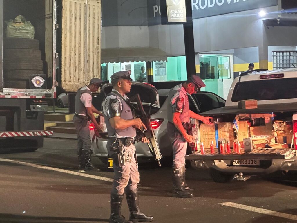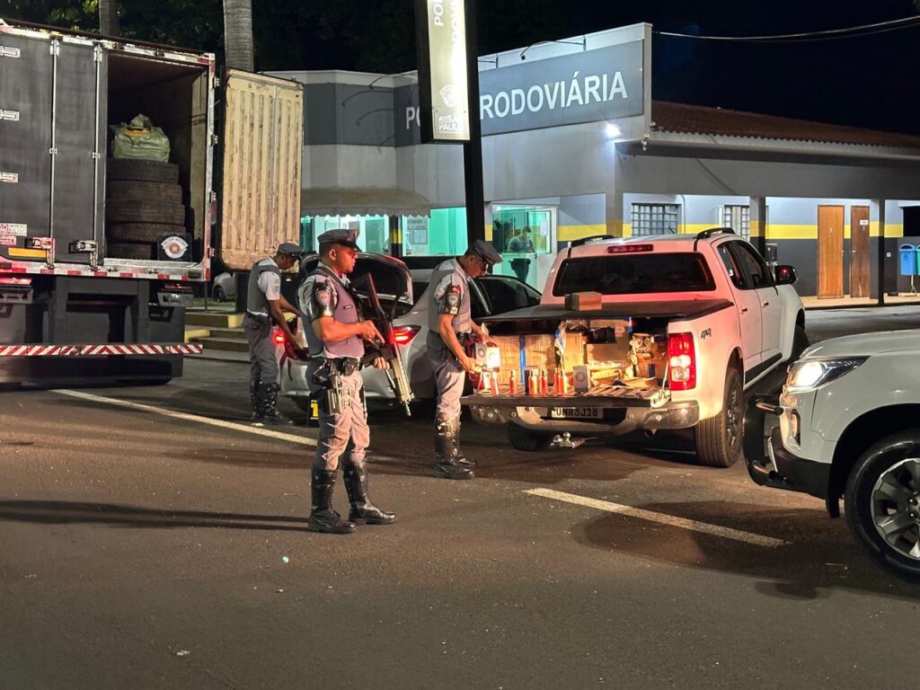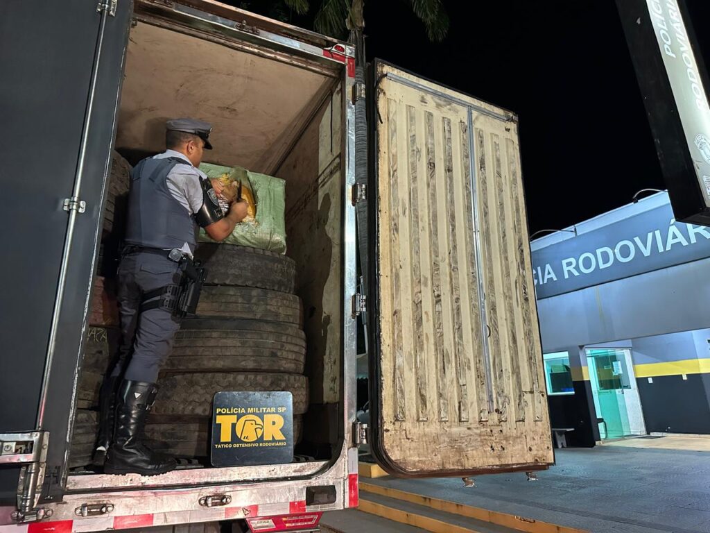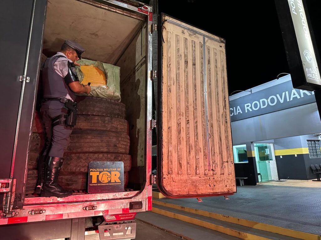 Presidente Prudente, SP- Durante a execução da “Operação Impacto”, a equipe do GP/TOR da 2ª Cia de Polícia Rodoviária de Presidente Prudente, juntamente com a equipe de Patrulha Rodoviária, abordou um veículo VW/19.320, com placas de Presidente Prudente (SP), tracionando um semirreboque. Durante a fiscalização, foram encontradas mercadorias estrangeiras, como roupas e óculos, no compartimento de carga, sem a devida documentação fiscal. As mercadorias estavam escondidas em diversas caixas, camufladas atrás de carga de pneus destinados ao descarte.