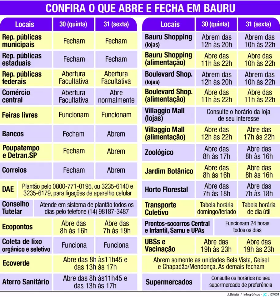 Bauru, SP- Com a proximidade do feriado de Corpus Christi, a Prefeitura de Bauru divulgou os horários de funcionamento de repartições públicas e outros serviços oferecidos pelo poder público. Confira abaixo o que estará aberto e fechado durante o feriado: