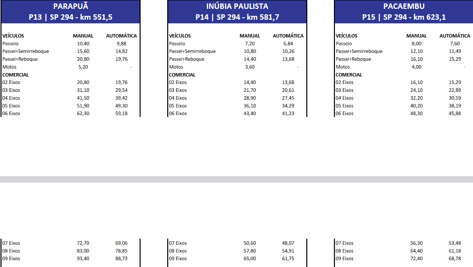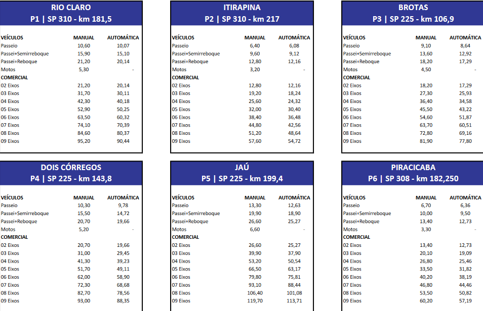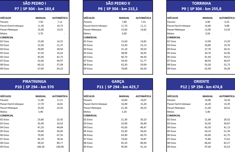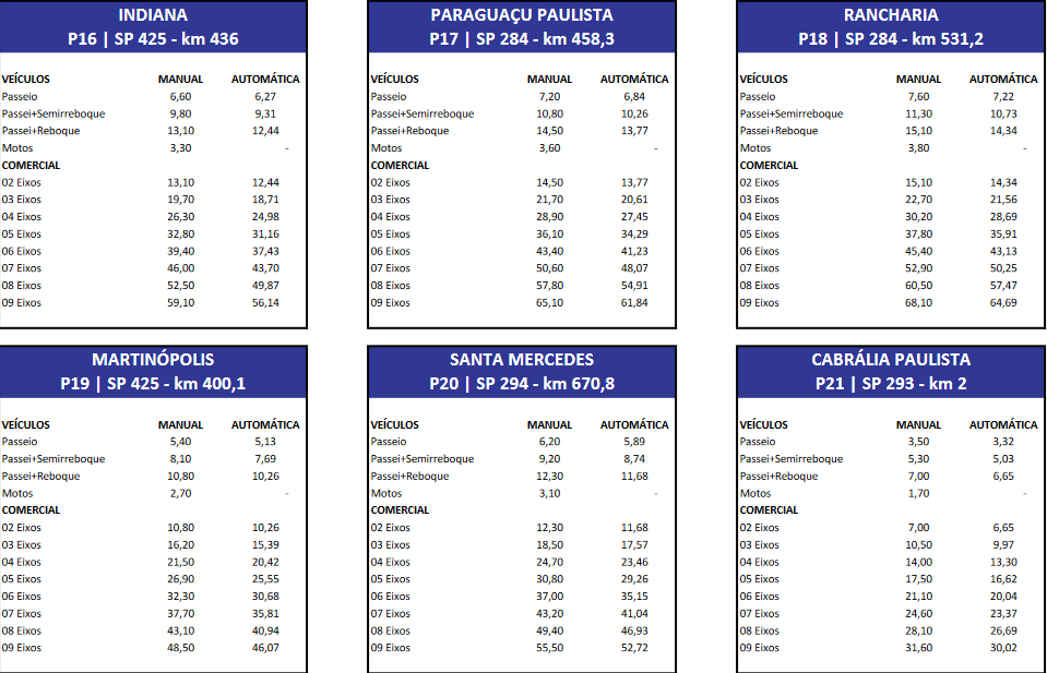 Especificamente, o pedágio na praça de Garça passará a custar R$ 10,60 para automóveis e R$ 5,30 para motocicletas. Em Oriente, os valores subirão para R$ 10,80 para veículos de passeio e R$ 5,40 para motos.