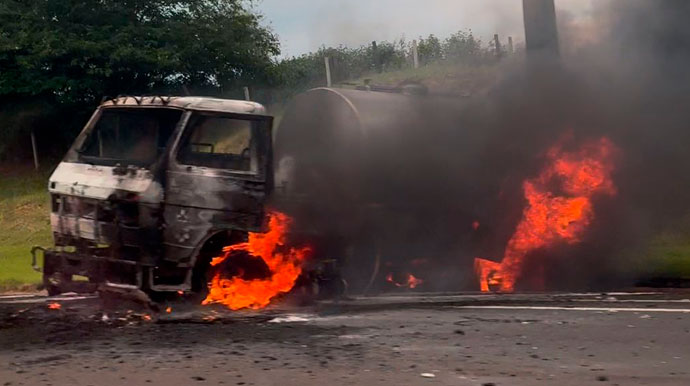 Marília, SP- Na tarde desta quinta-feira (23), um caminhão-tanque carregado com leite foi atingido por um incêndio enquanto trafegava pelo km 354,370 da Rodovia Rachid Rayes (SP-333), em Marília.